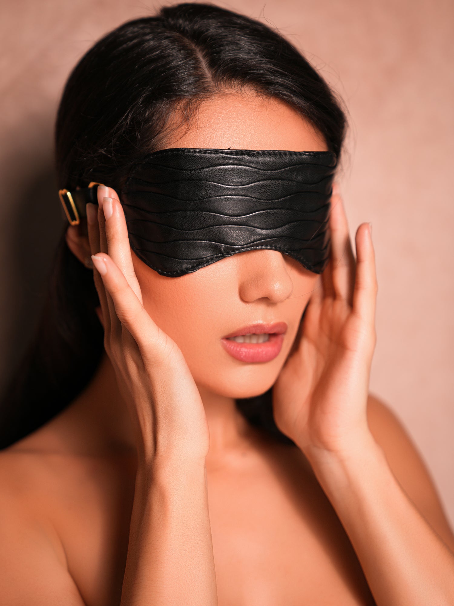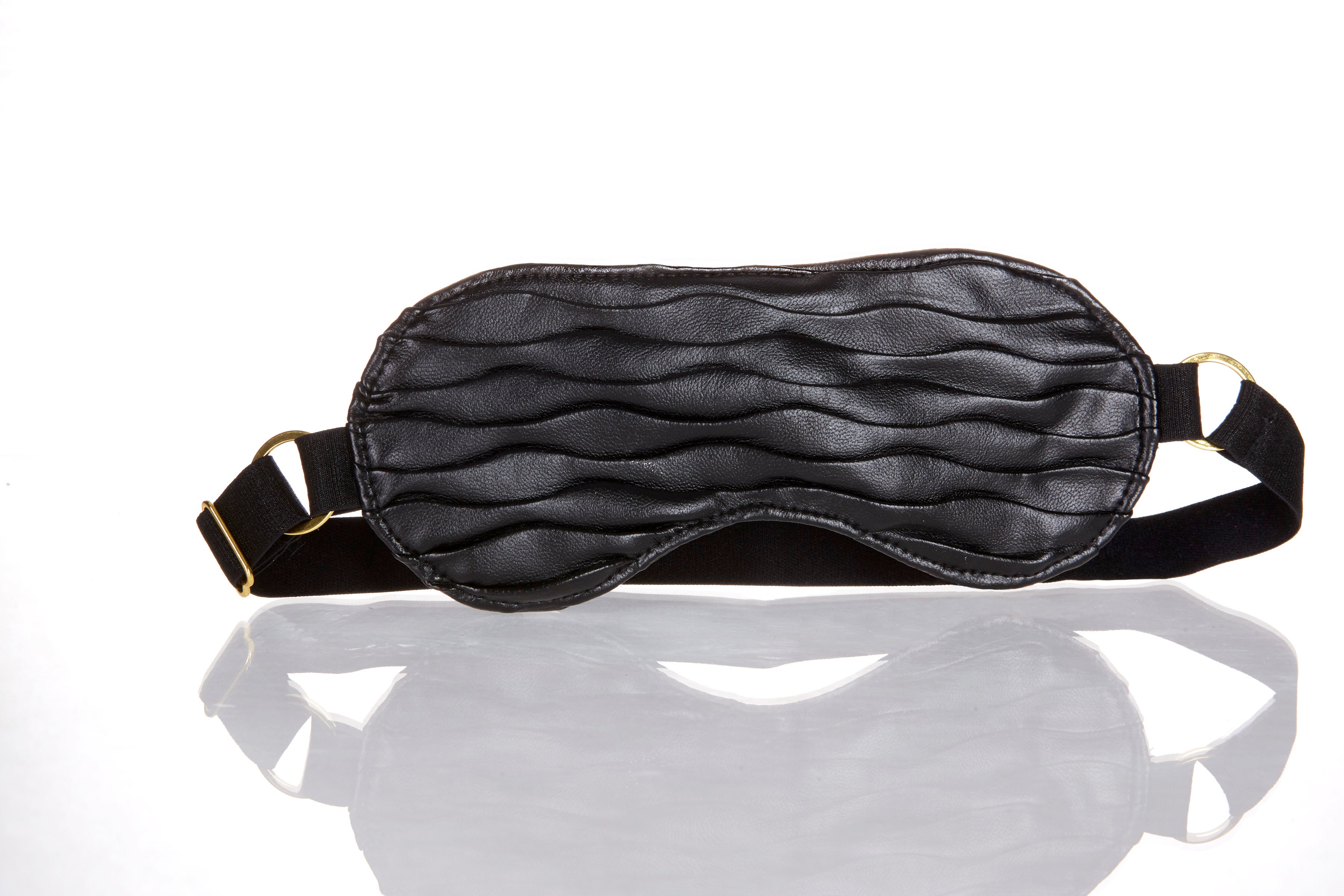 Butter soft ruched faux leather mask, with polished gold finish accents embedded in the adjustable wide satin finish strap.