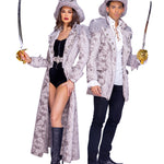 This costume is an exquisite Deluxe Pirate Queen outfit, perfect for commanding the high seas or making a grand entrance at any Halloween event. The design features a luxurious, full-length brocade coat in an elegant silver-grey hue, adorned with intricate floral patterns. The coat has a regal, fitted silhouette with detailed button accents, metallic shoulder epaulets, and a wide, embellished belt buckle, adding an air of sophistication and authority.