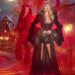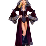 This costume is the Deluxe Red Riding Hood, perfect for those who want to command attention with a regal and mysterious presence this Halloween. The outfit features a luxurious full-length velvet robe in a rich burgundy hue, trimmed with lush faux fur at the hood, cuffs, and hem. The deep color and soft texture of the velvet create a captivating, opulent look, while the faux fur adds a touch of wintry elegance.