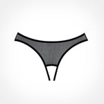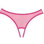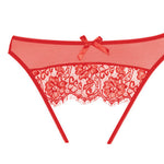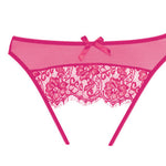 - Hidden desires revealed in this seemingly secretive sheer mesh crotchless panty, with eyelash lace caressing the ouverte derriere. That it is topped with a bow is a wink of sweet, sprinkled over a flow of naughty.