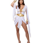 This stunning Halloween costume is the "Sultry Goddess" ensemble, perfect for embodying timeless beauty and divine elegance. The outfit features a flowy white dress with a deep V-neckline, delicately adorned with gold trim that highlights the bust and waist. The draped fabric creates a graceful and ethereal silhouette, flowing effortlessly with each step.
