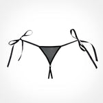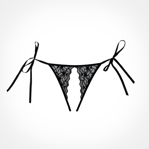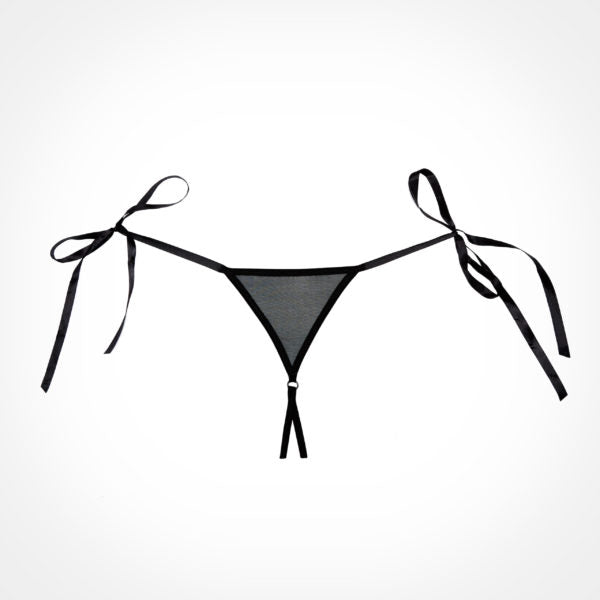• Teasing skinny ribbons decorate the hips, waiting to be undone. Scalloped lace outlines a provocative ouverte front, while the Brazilian back is topped with a triangle of sheer mesh.