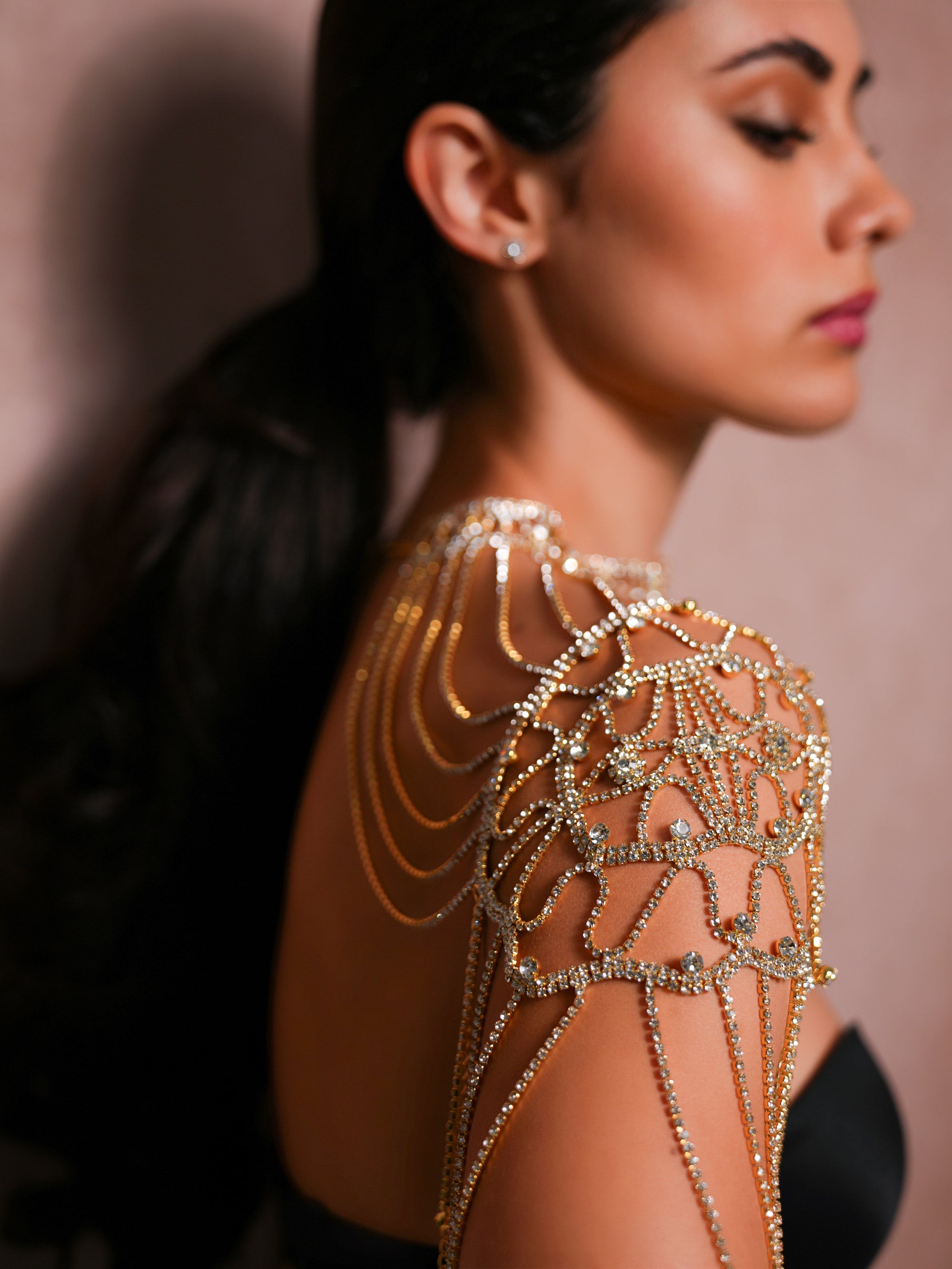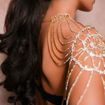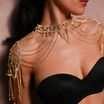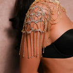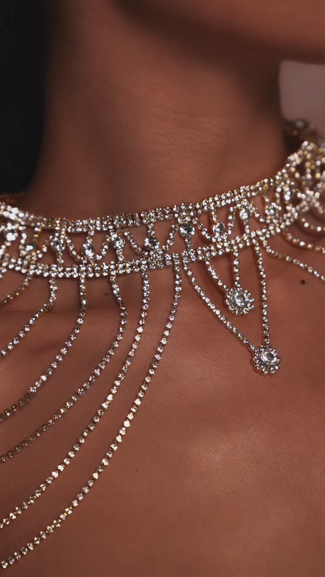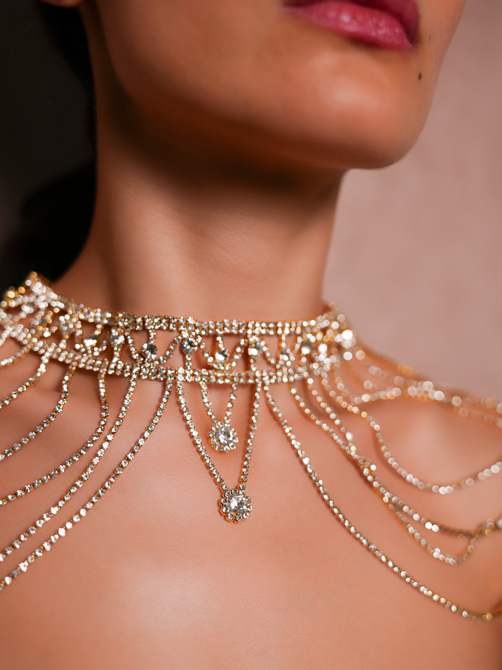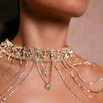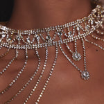 Features a structured choker neck that flows into delicate, multi-layered rhinestone chains.
