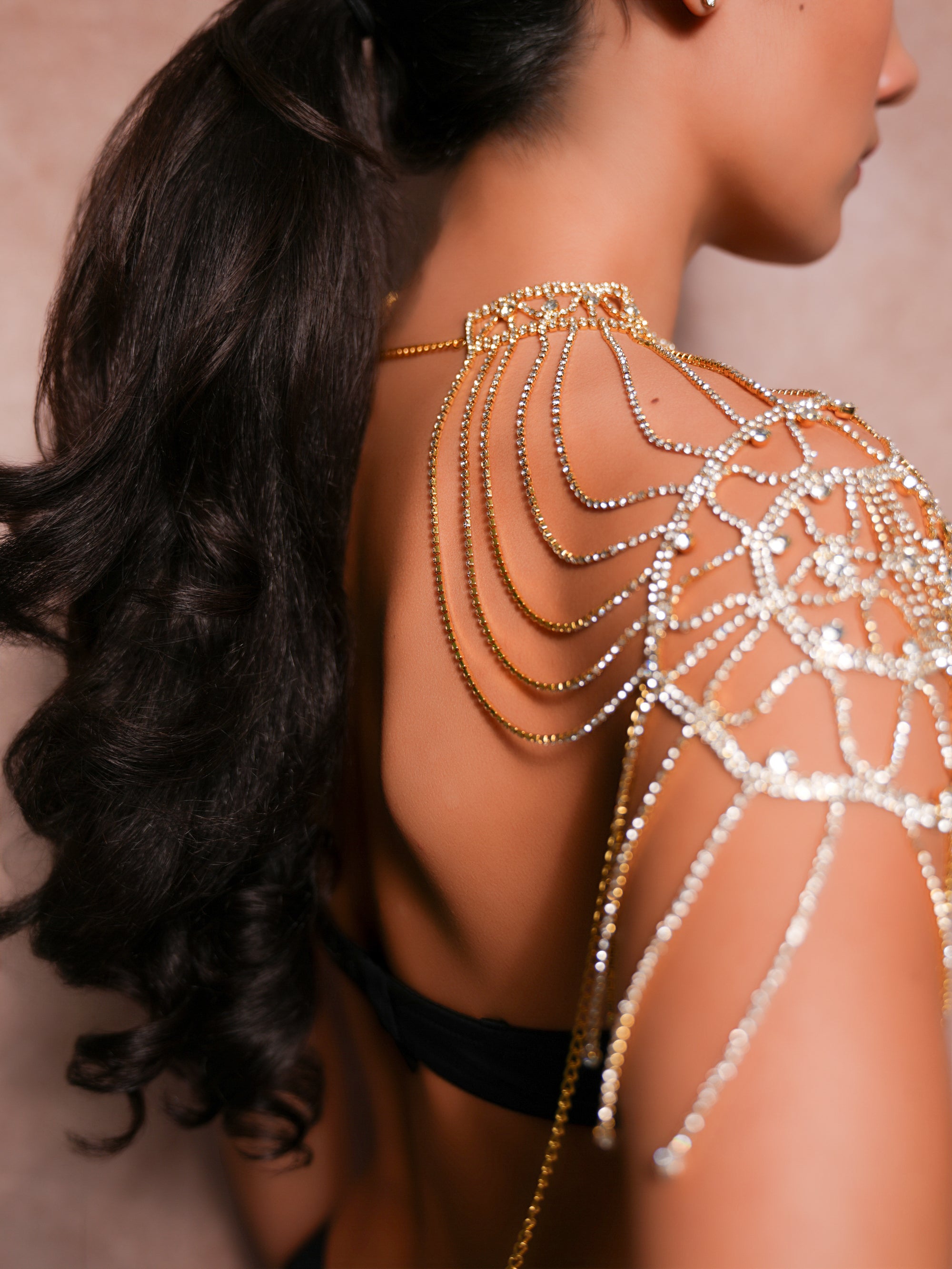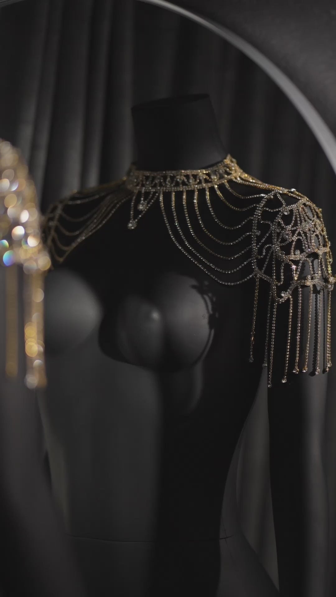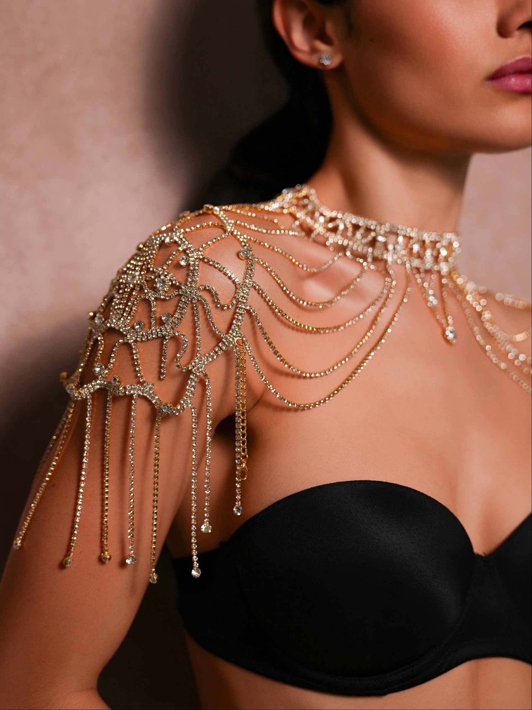 Features a structured choker neck that flows into delicate, multi-layered rhinestone chains.