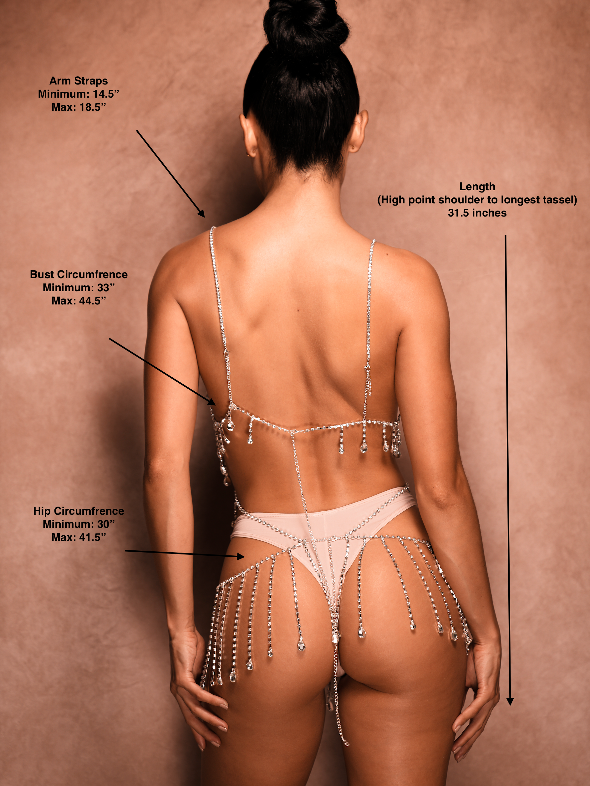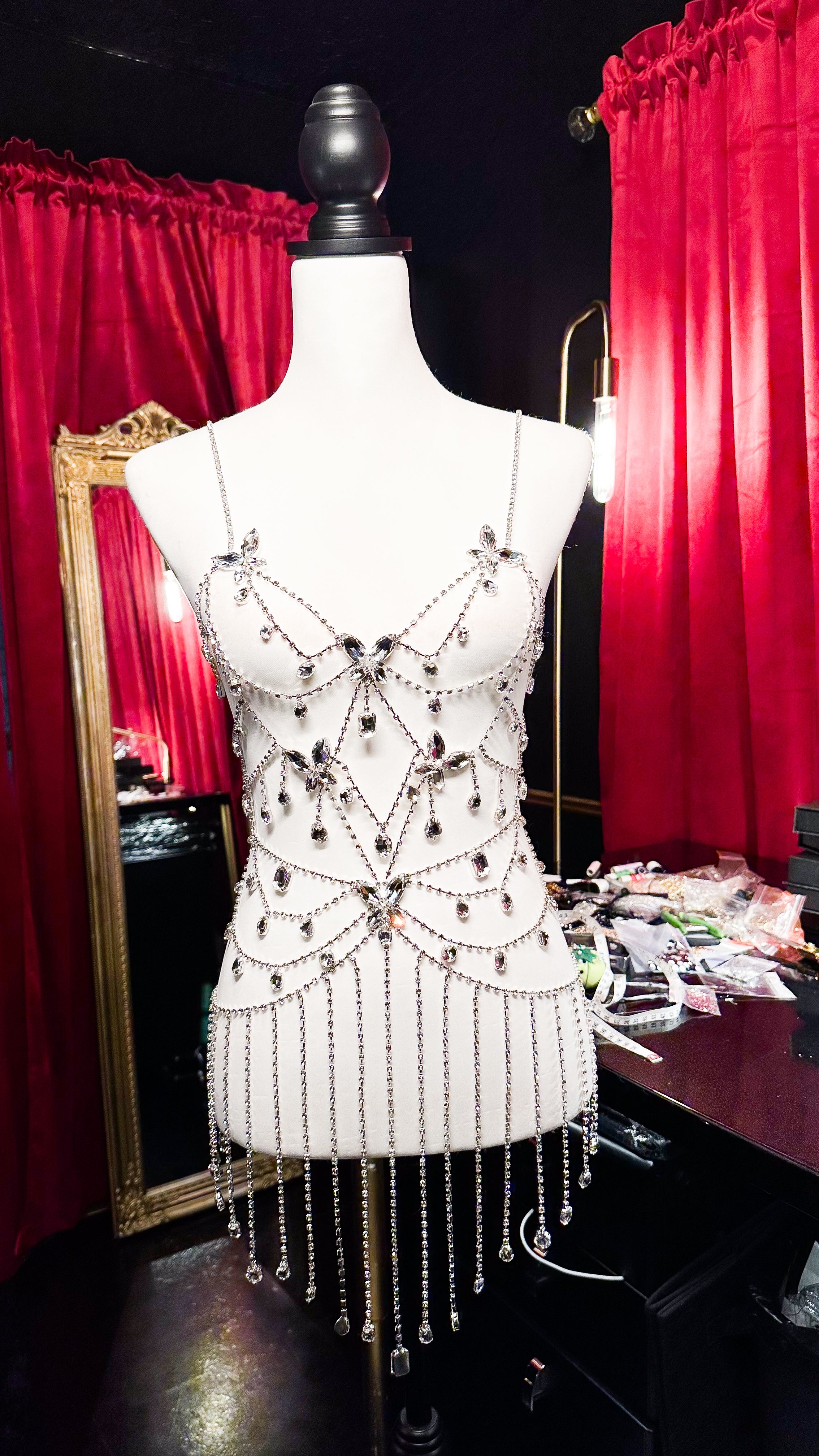 Step into divine elegance with Crystal Fall, a breathtaking, statement-making piece designed to adorn your body in cascading crystals. Featuring a mesmerizing web of shimmering rhinestones and teardrop gems, this bodysuit is the epitome of luxury and seduction.