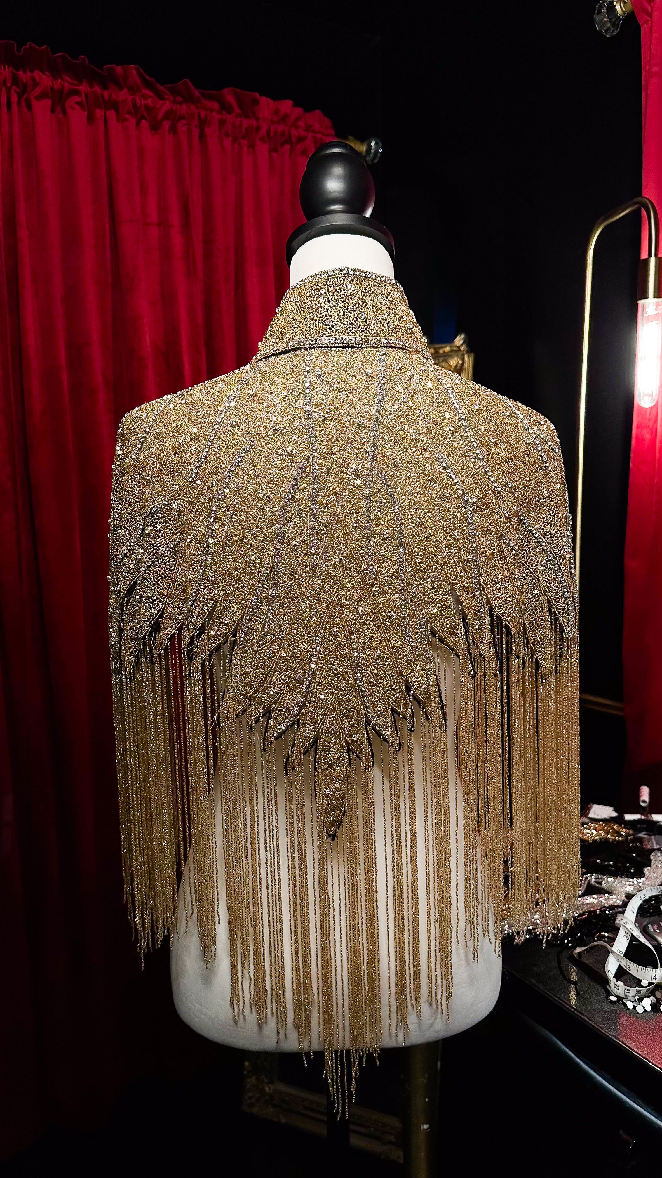 - Handmade designed gold and silver sequins, glass beads and stones with gold fringes