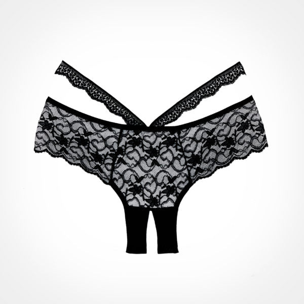 • A whirlwind of scalloped lace covers your hips and derriere in this sumptuous open gusset boy cut panty, with high lace straps that sweep up on an angle to create an hourglass effect