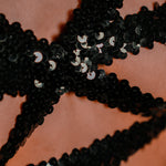 - Elasticized sequins covered bands hug the body accentuating each and every curve with serious sparkle.