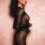 - Long sleeve silhouette with intricate lace-inspired design