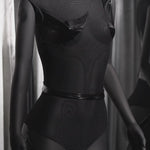 - Mesh bodysuit with latex-look vinyl cutouts & garters.