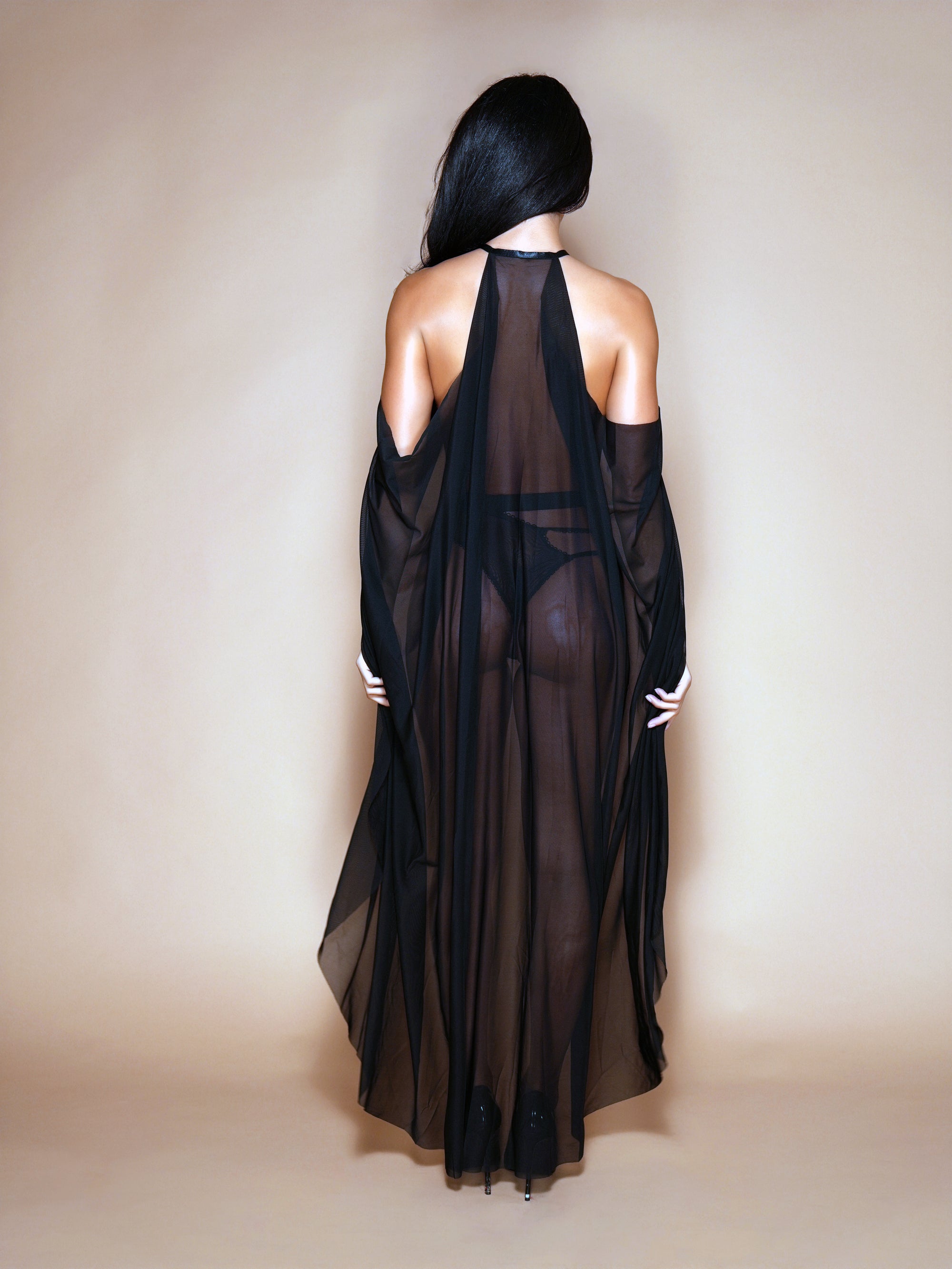 - Hook closure at the neck, shoulders are bare as the sheer mesh capes swooshes around the body.