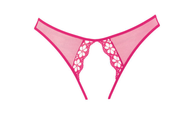 - A mélange of sheer mesh and flower lace with picot trim, makes this panty with peekaboo cut outs in front and back, deliciously naughty.