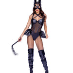 The costume comes complete with a set of tall, pointed bunny ears and a matching eye mask, perfect for channeling your inner mysterious and captivating persona. Fishnet tights and over-the-knee patent leather boots add to the overall provocative look, while the included whip accessory emphasizes the dominant theme.