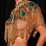 Flowing strands of shimmering gold fringe drape effortlessly, creating movement and allure with every step.