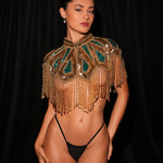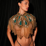 Designed with rich emerald sequin panels framed in golden beading and sequins