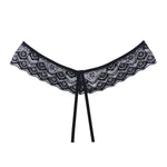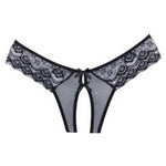 - Foray into pleasure without a thought. Open Panty with thick lace bands hugging the sides, dual bow trim with skinny back straps. Crotchless.