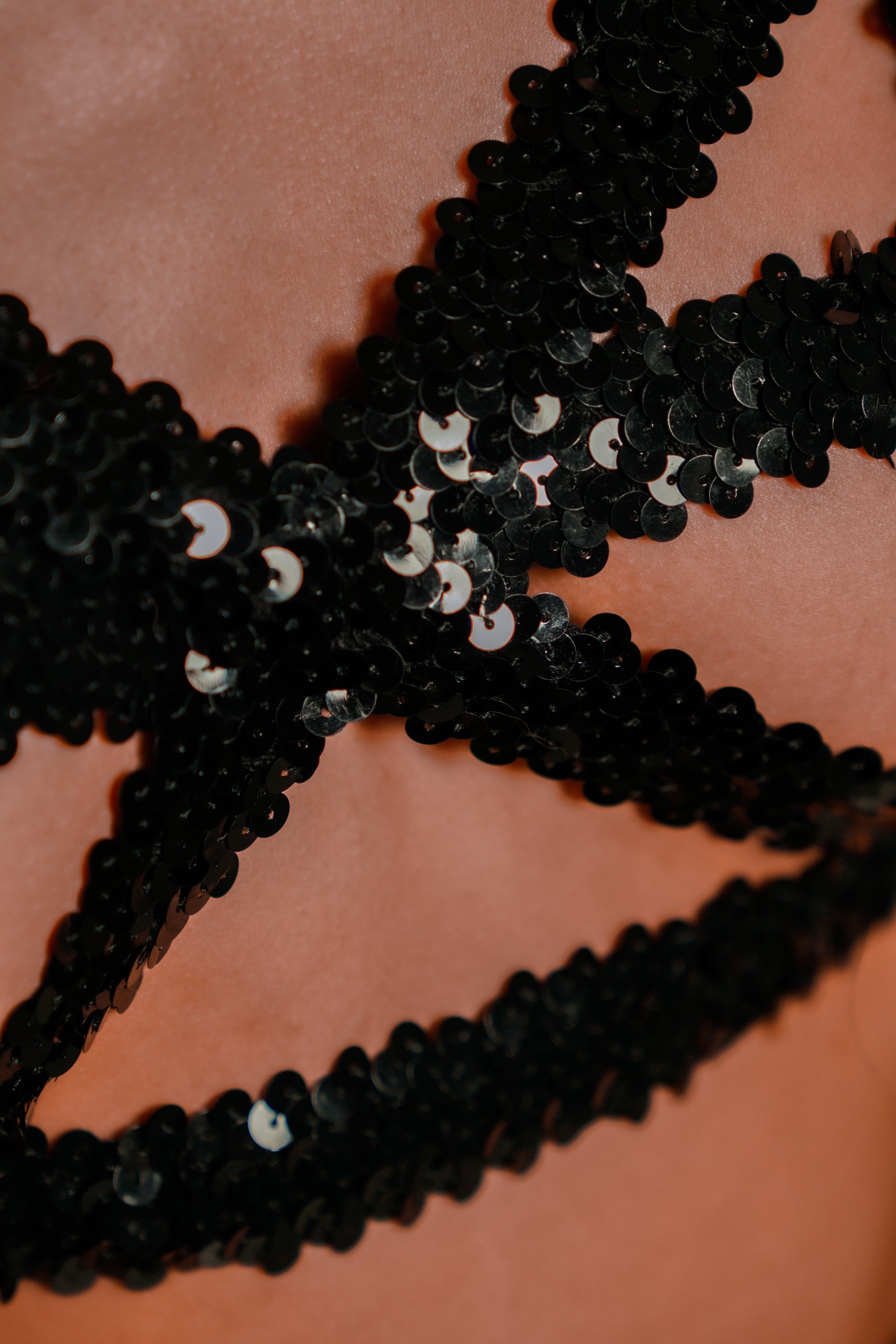 - Elasticized sequins covered bands hug the body accentuating each and every curve with serious sparkle.