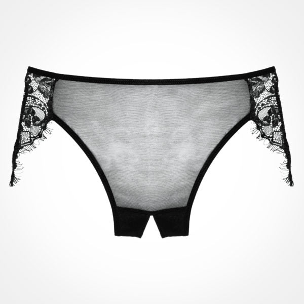 Dreamy crotchless mesh panty with luscious kisses of wispy eyelash lace on the hips